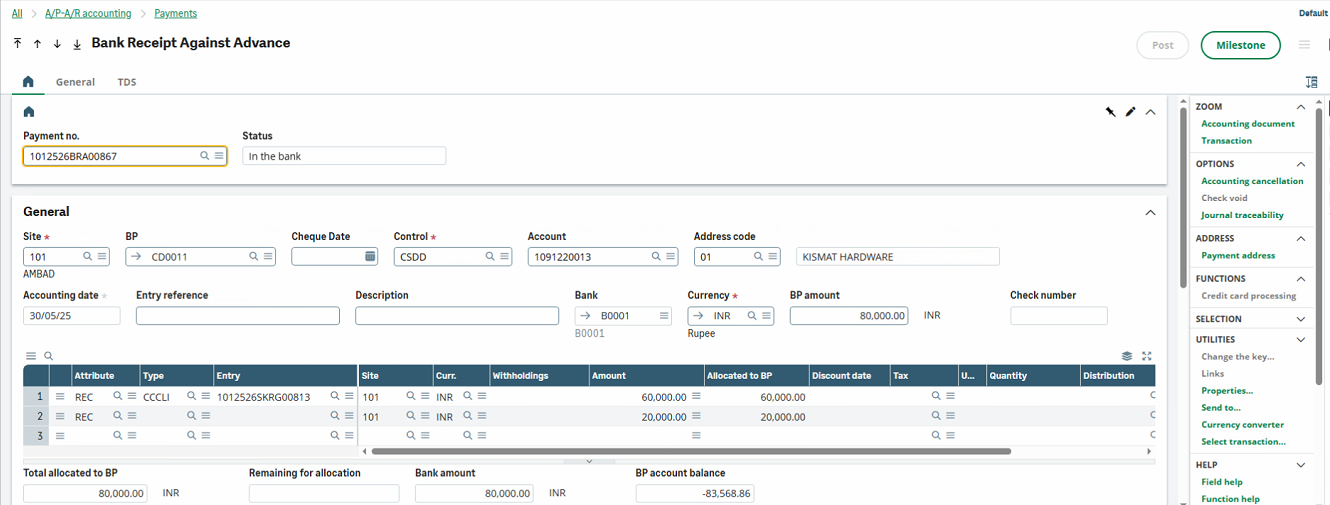 - Once the sales order or invoice is generated, the advance payment must be allocated to it using the Customer Allocation function.