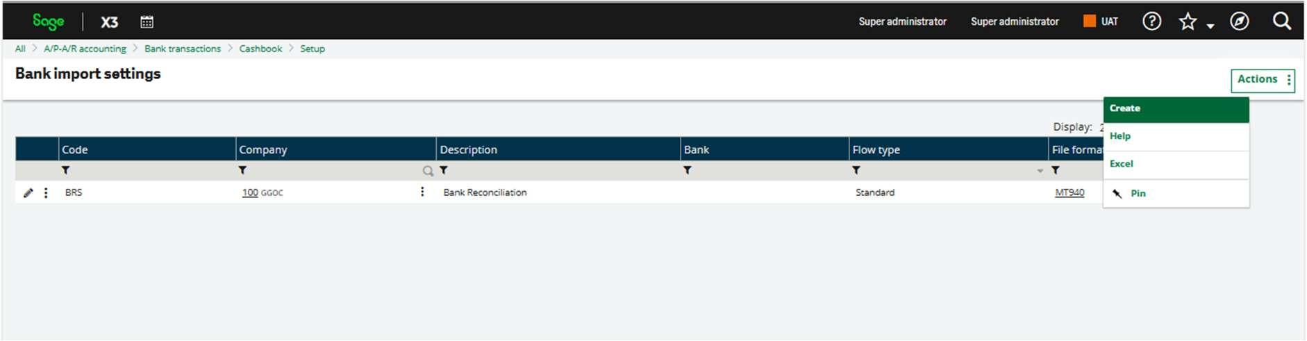 You can create a new bank import setting by clicking on the ‘Createbutton from the Action button.
