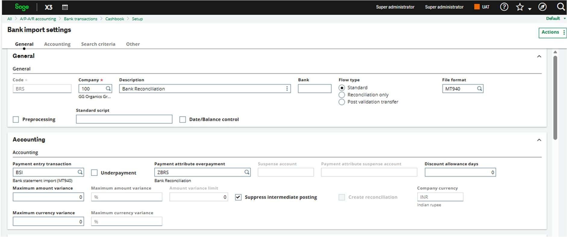 Bank Import Setting in Sage X3 is used to configure how electronic bank statements are imported and interpreted in the system. It allows you to define the bank file format, map the statement fields to Sage X3 fields, and set rules to automatically identify and match transactions. This helps automate bank reconciliation, reduce manual entry, and ensure accurate posting of receipts, payments, and bank charges.