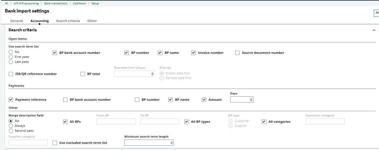 This section controls how Sage X3 tries to find open invoices / open items to match with the bank statement lines.
