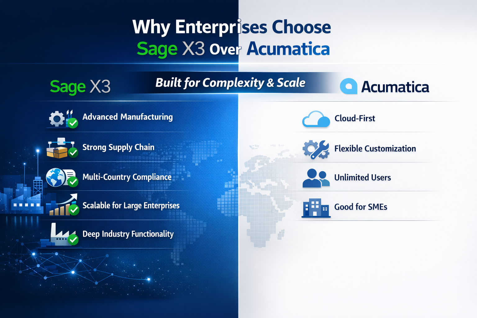 Indian enterprises are choosing Sage X3 over Acumatica to secure a distinct market advantage, align with their project timeline, and achieve their ultimate business vision. Sage’s expertise in implementation, integration, and customization allows them to ensure a smooth transition, improve operational efficiency, and maximize long-term returns on investments.
